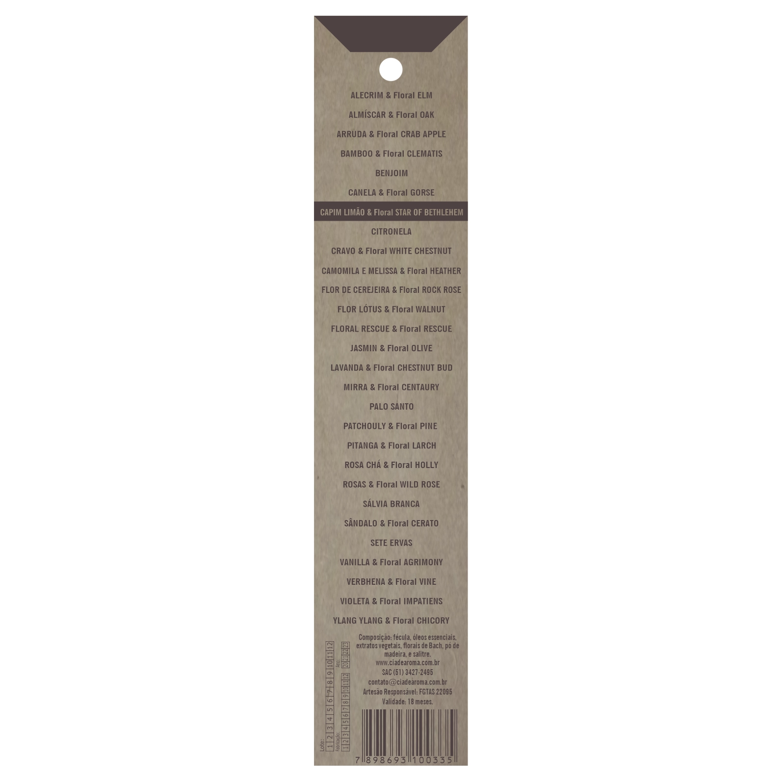 Composição: fécula, óleos essenciais, extratos vegetais, florais de Bach, pó de madeira e salitre.